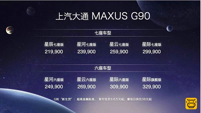 【牛奔购车网】4月29日,全尺寸新生代智能MPV上汽大通MAXUS G90正式上市,七座推荐款车型售价为21.99万元-29.99万元,六座推荐款车型售价为24.99万元-32.99万元,下订用户可享G刻新生“贷”福利:超高金融贴息,首付低至3.6万元,最低日供仅需36元。