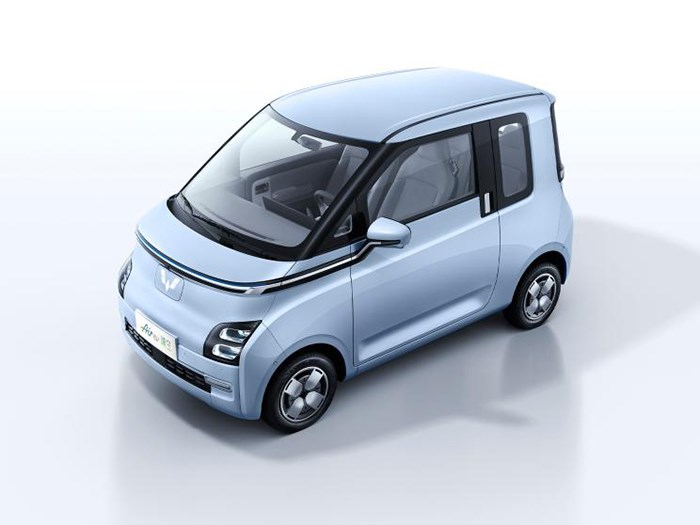 侧面来看,新车采用了与五菱宏光MINIEV相类似的双门车身结构,并同样定位为一款城市微型电动车。车身尺寸方面,新车长宽高分别为2974/1505/1631mm,轴距2010mm。车身尺寸与宏光MINIEV十分相仿,内部采用2 2的座椅布局。