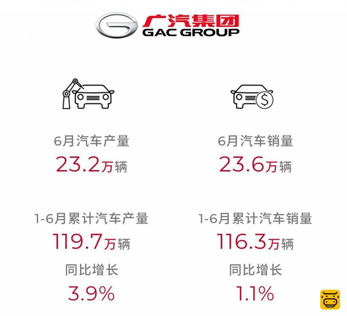 广汽传祺品牌 6 月产量为 3.7 万台,同比增长 9.6%;6 月销量为 4.1 万台,同比增长 25.9%。今年 1-6 月,广汽传祺品牌累计产量达 18.2 万台,同比增长 7.3%;1-6 月累计销量达 18.8 万台,同比增长 9.0%。