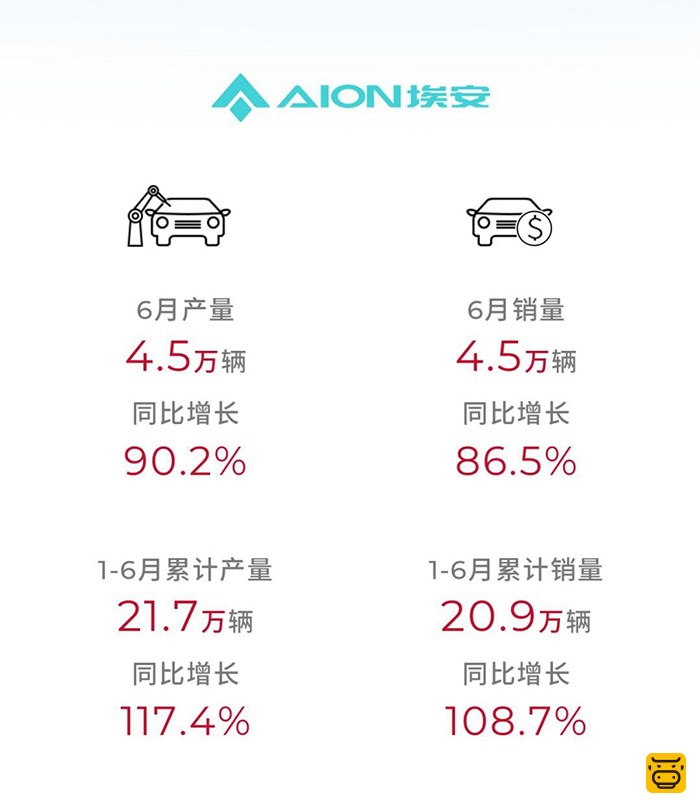 从具体品牌来看,埃安品牌 6 月产量为 4.5 万台,同比增长 90.2%;6 月销量为 4.5 万台,同比增长 86.7%。今年 1-6 月,埃安品牌累计产量达 21.7 万台,同比增长 117.4%;1-6 月累计销量达 20.9 万台,同比增长 108.8%。其中,AION S 系列车型 6 月销量达 22,487 台,AION Y 系列车型 6 月销量达 20,537 台。