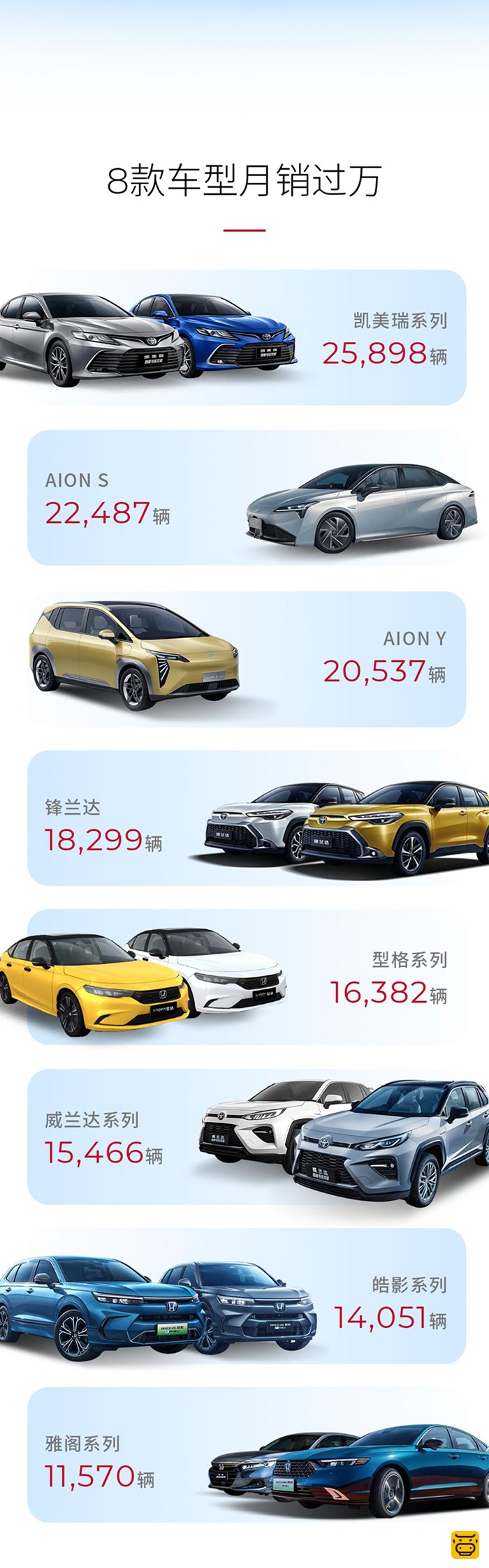 广汽集团旗下有8款6月销量过万车型,第一名是经典家用车凯美瑞系列,销量为25898辆。排在第二位的是埃安两款纯电动车型,其中AION S共售出22487辆,AION Y共售出20537辆。第三名是锋兰达,共售出18299辆;第四名则是型格系列,共售出16382辆。紧随其后的是威兰达系列,共售出15466辆;皓影系列,共售出14051辆;雅阁系列,共售出11570辆。