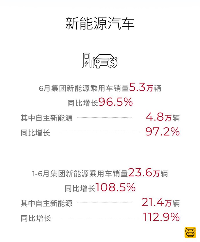 此外,广汽集团6月新能源乘用车销量5.3万辆,同比增长96.5%,其中自主新能源4.8万辆,同比增长97.2%。1-6月广汽集团新能源乘用车销量23.6万辆,同比增长108.5%。其中自主新能源21.4万辆,同比增长112.9%。