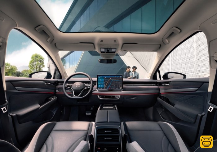 车内造型也紧随目前的潮流,简洁的横贯隐藏式空调出风口和巨大的中控触摸屏皆可以在不少品牌的内饰设计上看到,而方向盘样式也继承了ID.系列的家族式造型。配备了AR-HUD抬头显示,可以投影车辆的基本行驶信息、导航、预警、驾驶辅助信息等。新车在用最新的HMI系统,中控屏尺寸扩大到了15英寸,挂挡方式为怀档设计。此外,新车配备了ID.OS 2.0车机系统,车机内存升级到16G,界面和功能方面都有所提升。