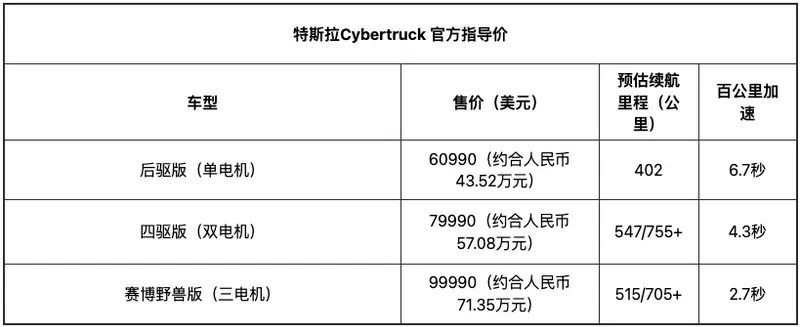 动力方面,特斯拉Cybertruck提供单电机、双电机、三电机三种供选择,其中单电机版续航为402km,百公里加速时间6.7秒;双电机版最大功率600马力,续航547km,使用里程扩展包续航可增加至755km,百公里加速4.3秒;三电机版最大功率845马力,续航515km,使用里程扩展包续航可增加至705km,百公里加速2.7秒。
