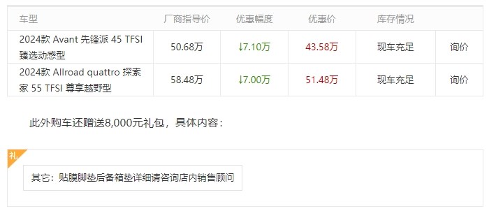 潍坊广宇奥迪奥迪A6优惠高达7.1万元,感兴趣的朋友可以到店咨询购买,具体优惠信息如下: