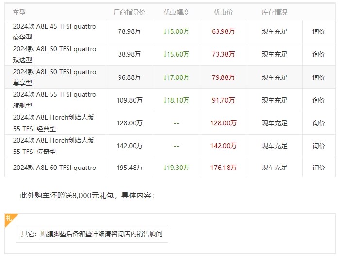 潍坊广宇奥迪奥迪A8优惠高达19.3万元,感兴趣的朋友可以到店咨询购买,具体优惠信息如下: