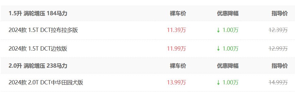 近日,本店内有哈弗大狗销售,颜色可选,目前购车部分车型可优惠1.00万元,感兴趣的朋友可以到店咨询购买,详情见下表: