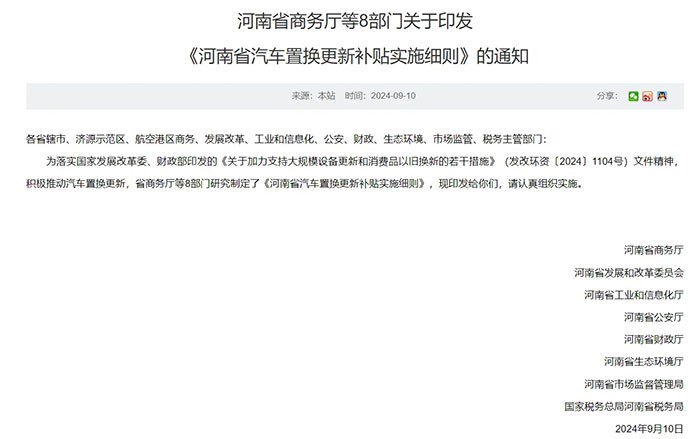9月10日,河南省商务厅、河南省发改委等8部门联合印发《河南省汽车置换更新补贴实施细则》,个人消费者在规定时间内售卖转让旧乘用车,购买新乘用车可享置换更新补贴。