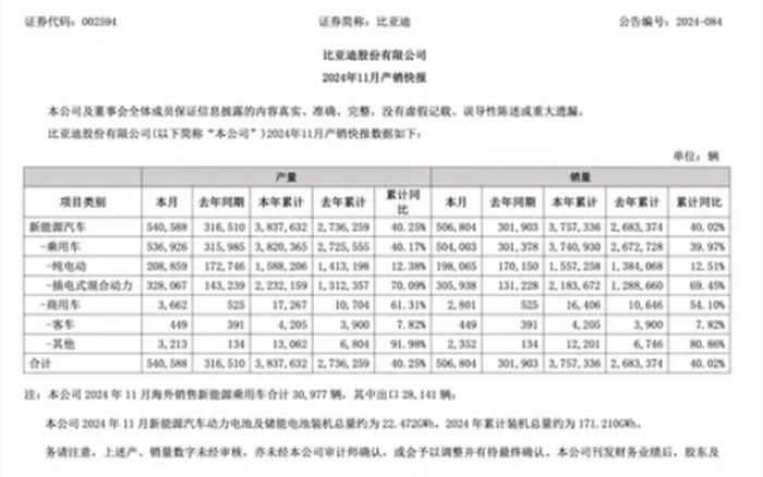 其中,在乘用车领域,比亚迪11月销售纯电动车型198065辆,插电式混合动力车型305938辆。10月乘用车海外销量为31192辆。11月海外销售新能源乘用车为30977辆,其中出口28141辆。