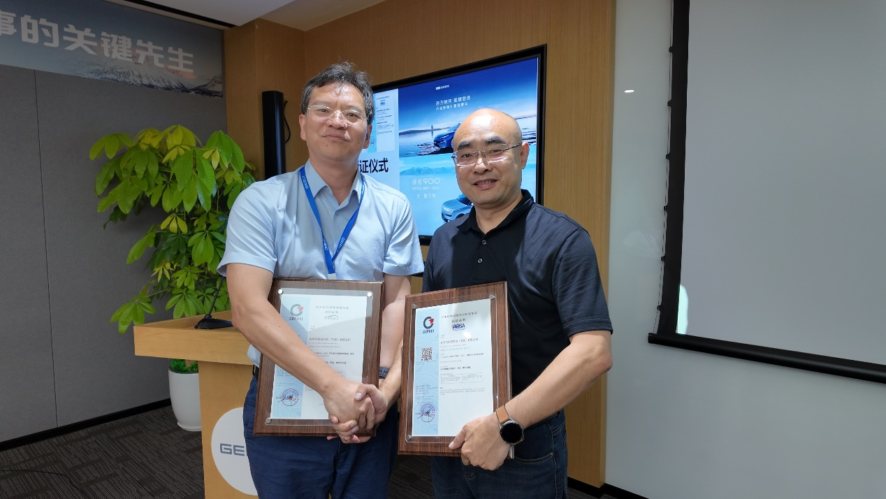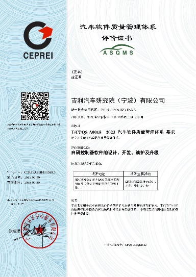 2025年6月23日,由赛宝认证中心向吉利汽车研究院授予的“汽车软件质量管理体系标准(ASQMS)”和“汽车软件(含 AI)质量安全管理标准(AUTOSQS)”证书颁发仪式在宁波杭州湾吉利汽车研究院举行。
