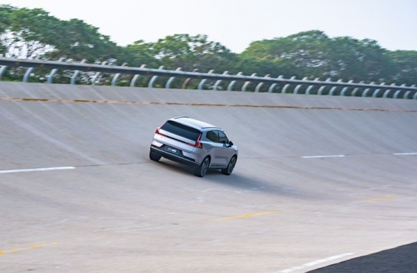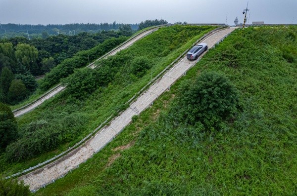 测试按照车辆最大允许总质量进行满载准备,在混动模式与纯电模式(SOC<40%)下分别挑战60%陡坡攀爬。要知道,常见地下停车场的坡度仅为15%左右,60%的坡度相当于日常场景的4-5倍,对车辆的扭矩输出、动力分配与车身控制均提出极高要求。实测中,XC70无论是从坡底起步还是坡道中间静止起步,均全程平稳行驶,未出现溜车、动力中断等问题,甚至无需将油门踩到底就能稳健抵达坡顶。
